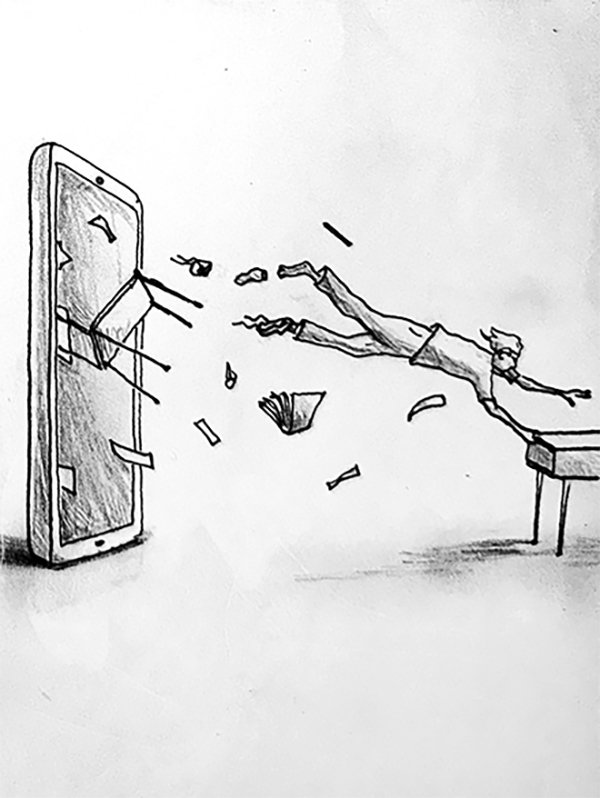 The interior feature image takes the concept further, depicting the student being drawn into a giant phone — a dramatic visualization of how easily the digital world can pull students away from the classroom.