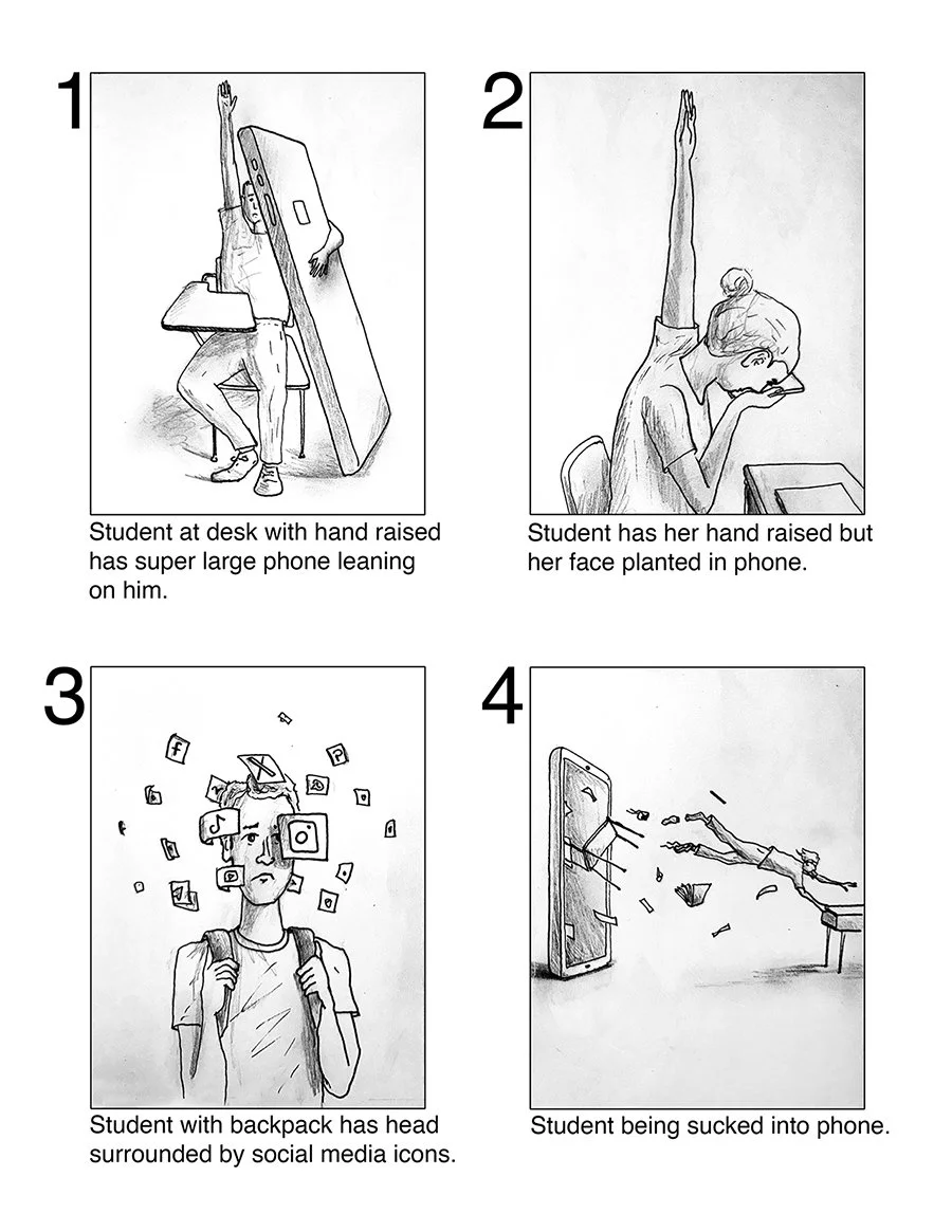 The image needed to feel contemporary and relatable while also delivering a clear visual metaphor for the story’s central question: are phones becoming too powerful a presence in the classroom?