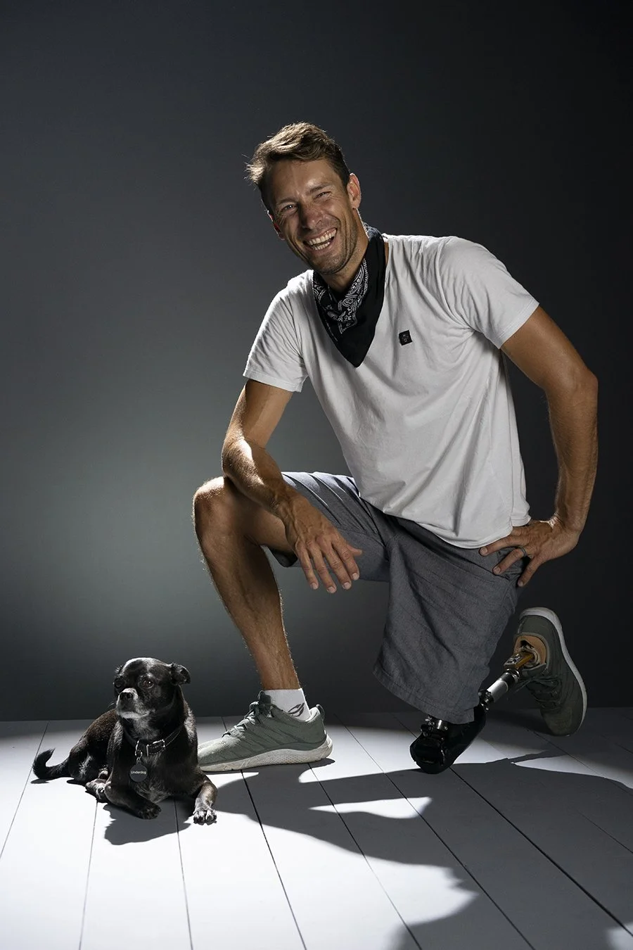 Pogo the three legged warrior photographed with his owner/guardian and fellow amputee.
